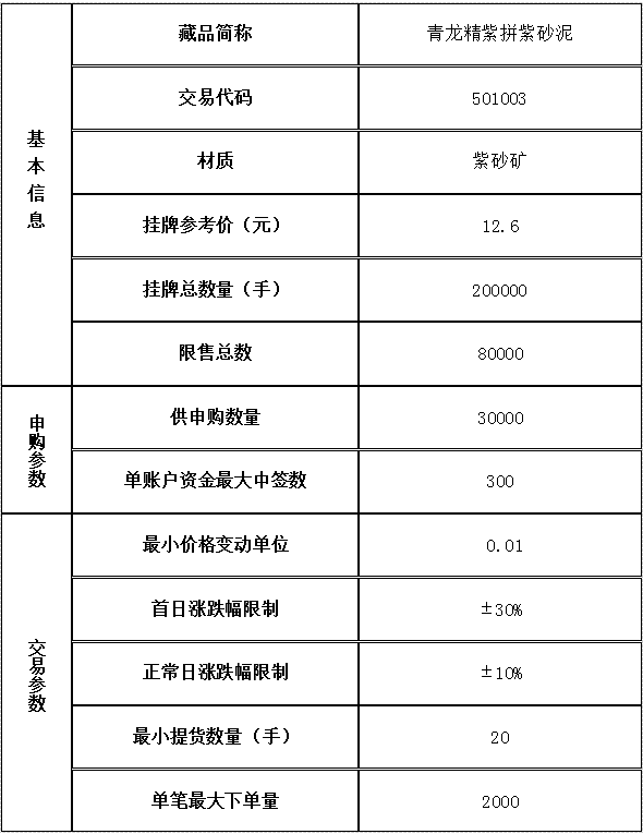 經(jīng)景德鎮(zhèn)陶瓷交易所有限公司(以下稱本交易所)發(fā)行會員申請,本交易所專家委員會、新藏品掛牌審核小組評估審核通過,對已經(jīng)完成托管入庫的藏品《青龍精紫拼紫砂泥》準予在本交易所線上實物交易系統(tǒng)正式掛牌交易,具體事項公告如下: